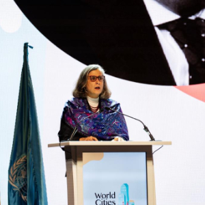 10月31日,在哥伦比亚波哥大,联合国人类住区规划署(人居署)执行主任阿纳克劳迪娅·罗斯巴赫在2025年世界城市日全球主场活动上讲话。