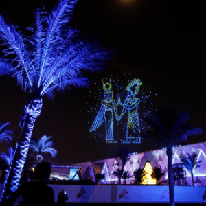 这是11月1日在埃及吉萨拍摄的开馆仪式上的无人机表演和灯光秀。