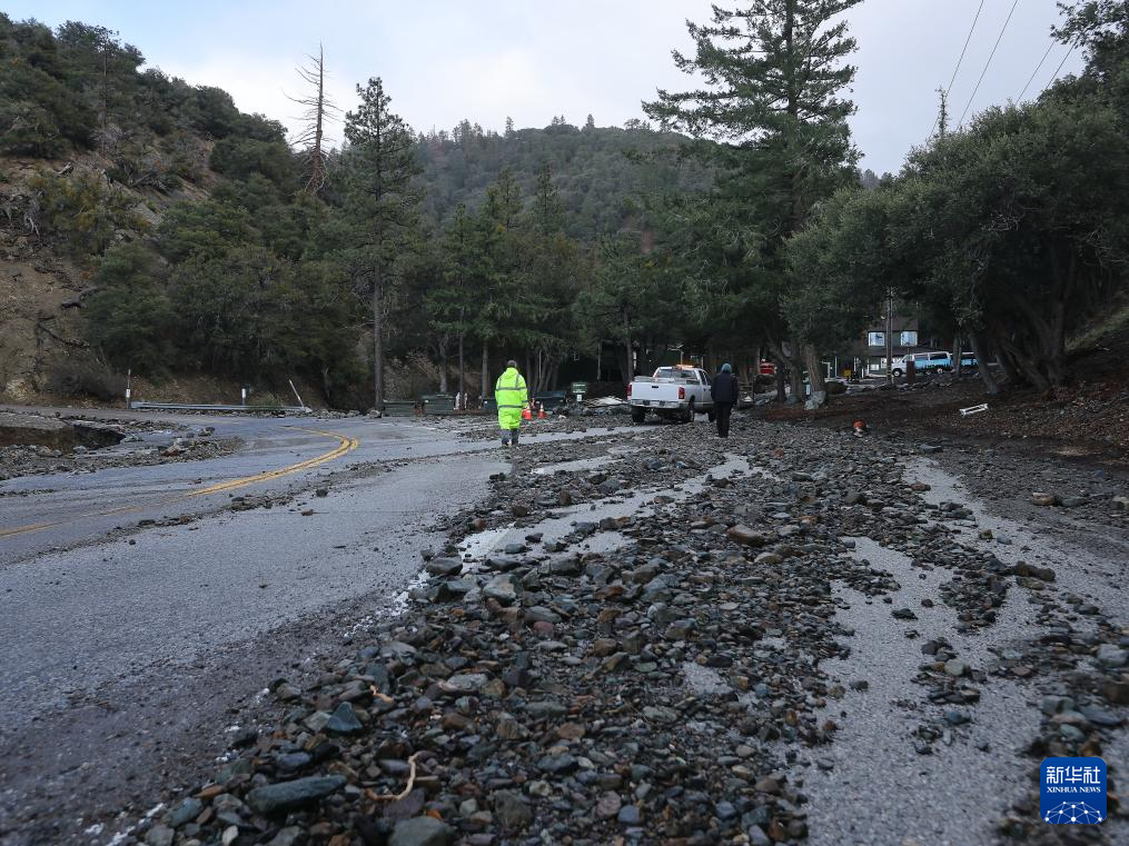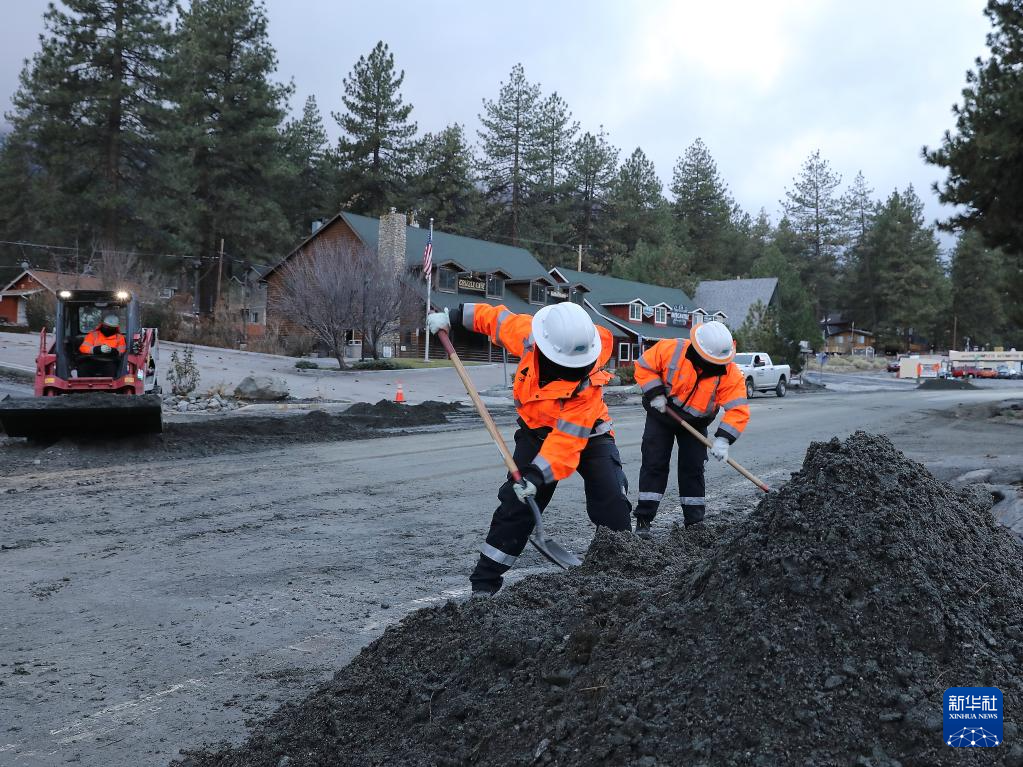 12月25日,在美国加利福尼亚州圣贝纳迪诺县赖特伍德,工作人员采取措施应对下一场冬季风暴。