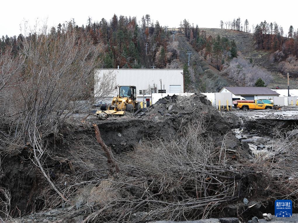 这是12月25日在美国加利福尼亚州洛杉矶县阿祖萨市附近拍摄的因水位大幅度上涨而受到冲击的河床。