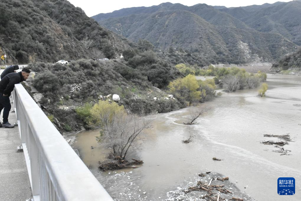 12月25日,在美国加利福尼亚州洛杉矶县阿祖萨市附近,人们观察一条水位大幅度上涨的河流。