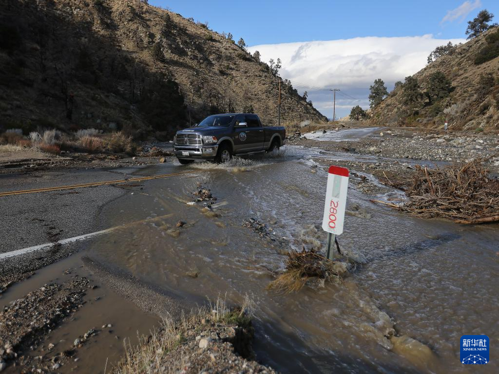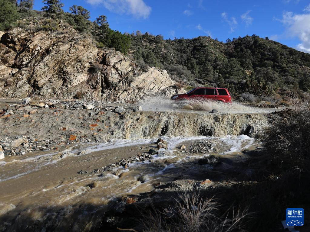12月25日,在美国加利福尼亚州圣贝纳迪诺县赖特伍德附近,一辆汽车行驶在积水的路面上。