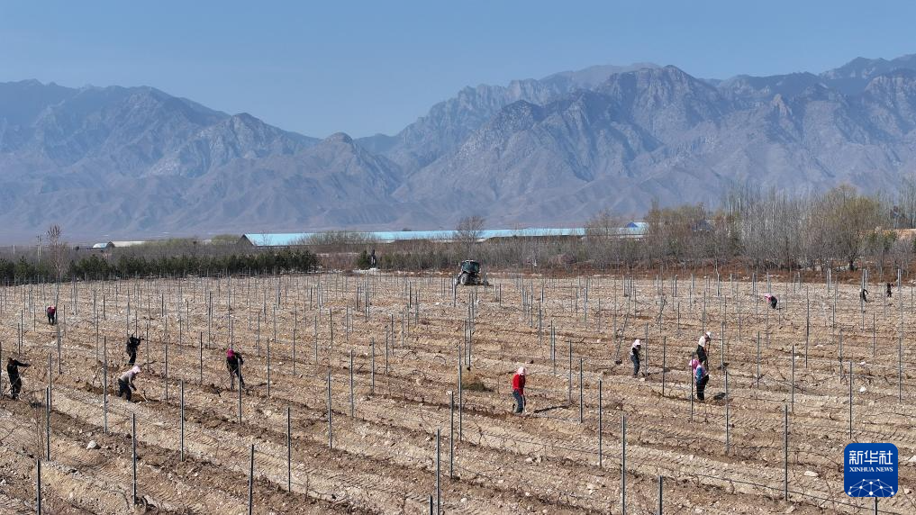 3月23日,工人在贺兰山东麓酿酒葡萄种植基地为葡萄展藤、培土(无人机照片)。