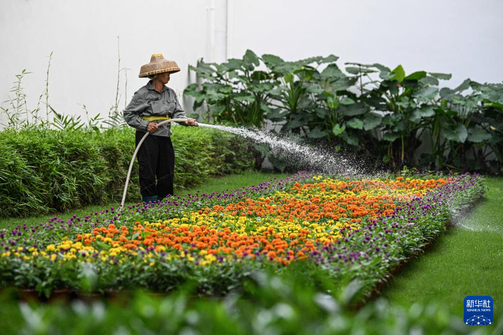3月27日,工作人员在博鳌亚洲论坛会场外给花草浇水。
