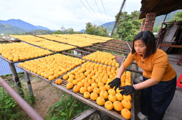 10月31日,福州市永泰县梧桐镇光荣村一柿饼加工厂工作人员在摆晒新鲜削皮后的柿子。