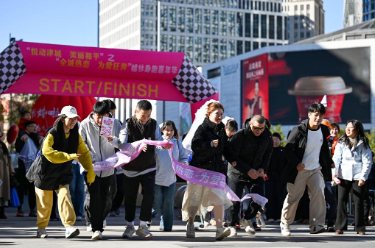11月2日,参加活动的情侣在婚纱趣跑比赛中起跑。
