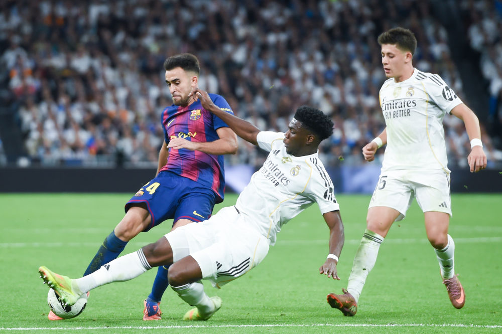 10月26日,在2025-2026赛季西班牙足球甲级联赛第十轮比赛中,皇家马德里队球员楚阿梅尼(中)在比赛中防守巴塞罗那队球员埃里克·加西亚(左)。新华社发(古斯塔沃·巴连特摄)