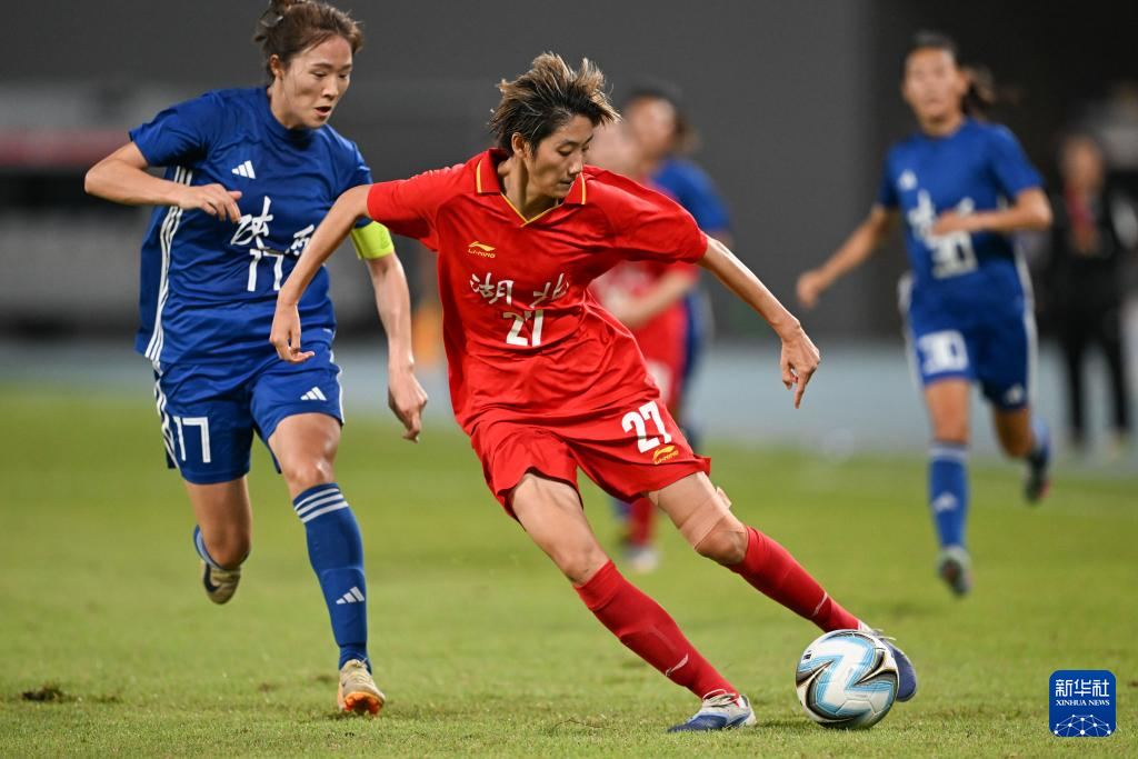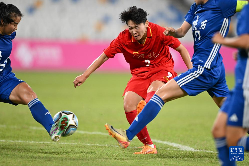11月6日,湖北队球员邓梦晔在比赛中射门得分。