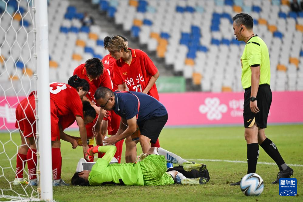 11月6日,湖北队守门员陈晨(下)在比赛中受伤倒地。