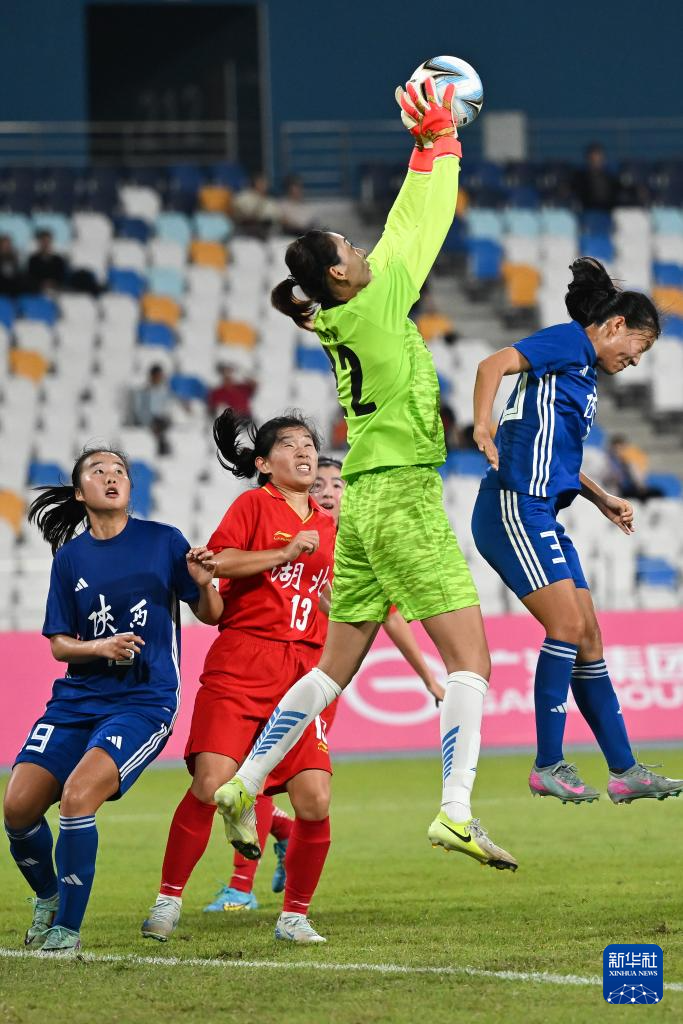 11月6日,湖北队守门员陈晨(上)在比赛中扑救。