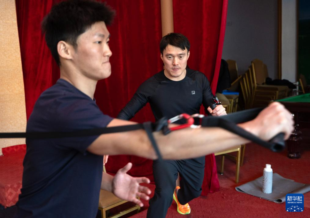 队员们的日常训练通常从清晨开始,天光初亮,他们已经在宾馆的走廊、会议室甚至电梯间门口开始拉伸和热身训练。简单的早饭后,他们会来到雪场顶着寒风反复起跳、旋转、落地,专注打磨每一个动作细节。三个小时的空中动作技术训练结束后,队员们在下午来到宾馆附近由食堂改造成的临时体能训练馆进行体能、力量训练。体能教练根据每个队员的身体状态科学安排训练强度和项目,确保他们在完成核心力量、爆发力及柔韧性等训练的同时保持良好状态。晚饭后,队员们相继走进由宾馆房间临时改造的恢复区,随队医生、康复师将为他们进行理疗、按摩,帮助他们恢复体能。