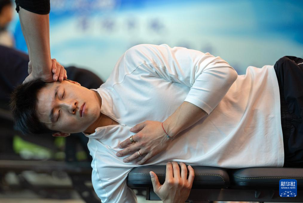 11月4日,在宾馆房间改造而成的临时按摩室里,自由式滑雪空中技巧国家集训队队员陈梅婷一边接受按摩,一边观看上午训练的视频。