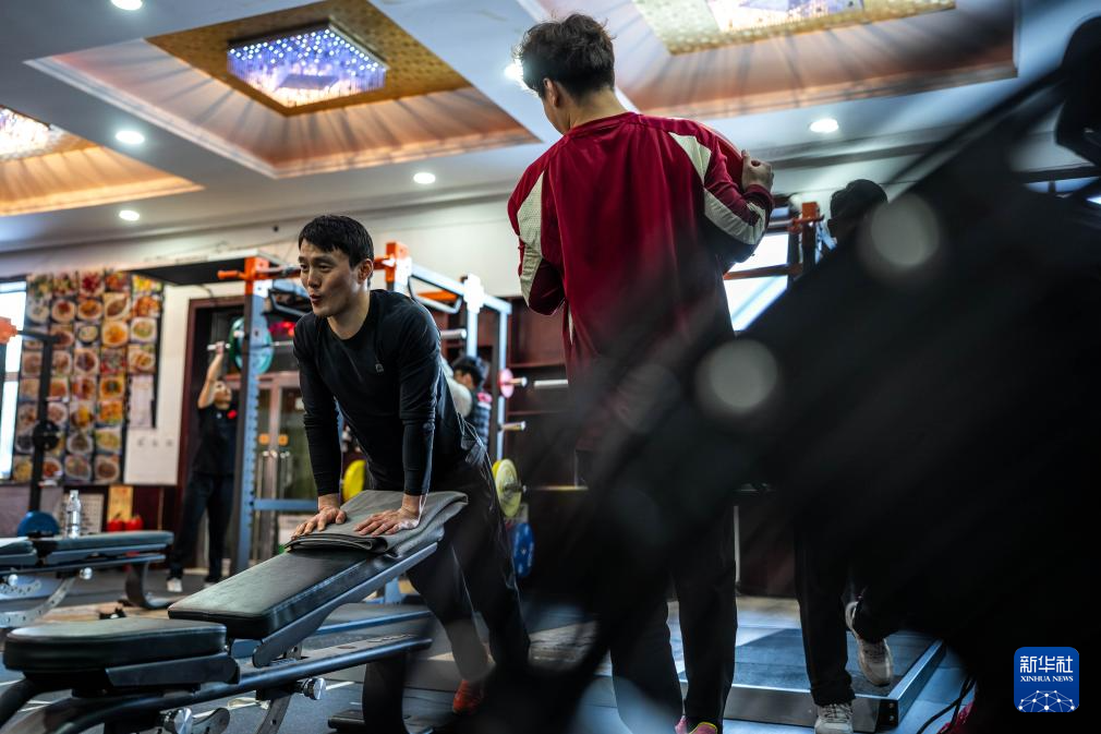 11月6日,在食堂改造而成的临时体能训练馆里,自由式滑雪空中技巧国家集训队队员齐广璞(右)和队友孙佳旭在进行体能和力量训练。