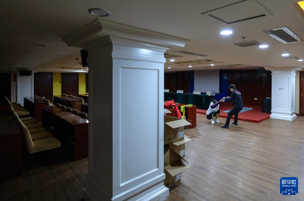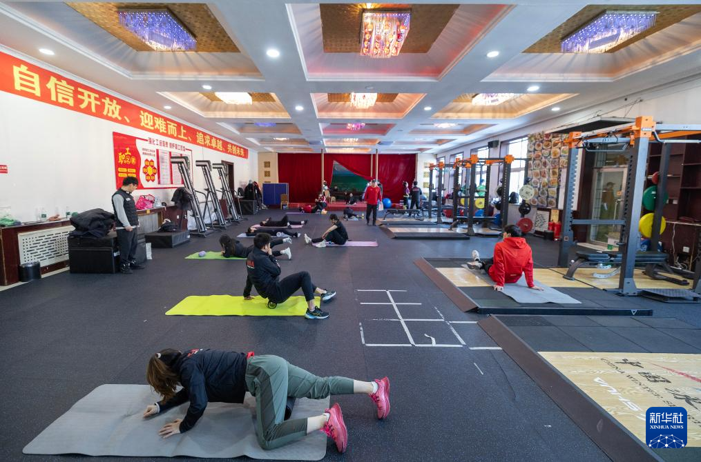 11月6日,在食堂改造而成的临时体能训练馆里,自由式滑雪空中技巧国家集训队队员在体能和力量训练开始前拉伸。