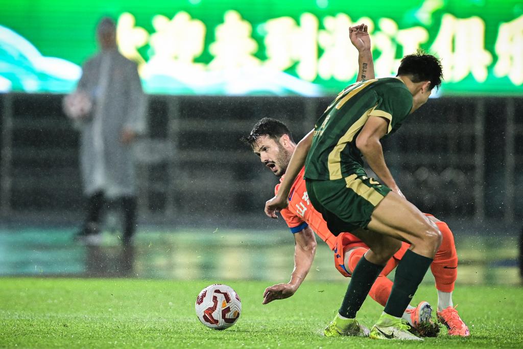 10月18日,山东泰山队球员卡扎伊什维利(后)在比赛中被浙江绿城队球员张瑷晖犯规后摔倒。当日,在2025赛季中国足球超级联赛第27轮比赛中,浙江绿城队主场2:2战平山东泰山队。新华社记者 江汉 摄