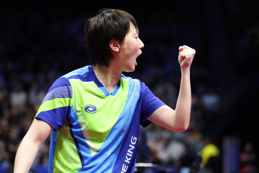 11月16日,黑龙江队选手王曼昱在比赛中庆祝。新华社记者 刘续 摄
