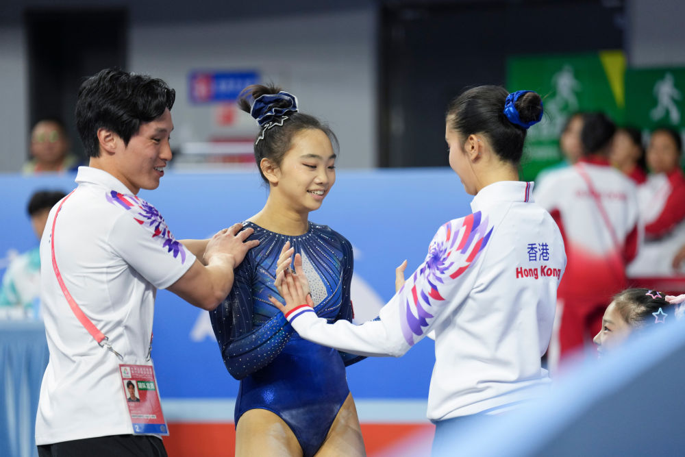 11月11日,香港队选手曾凯缘(中)在平衡木比赛完赛后与教练(左)、队友一起庆祝。新华社记者 胥冰洁 摄