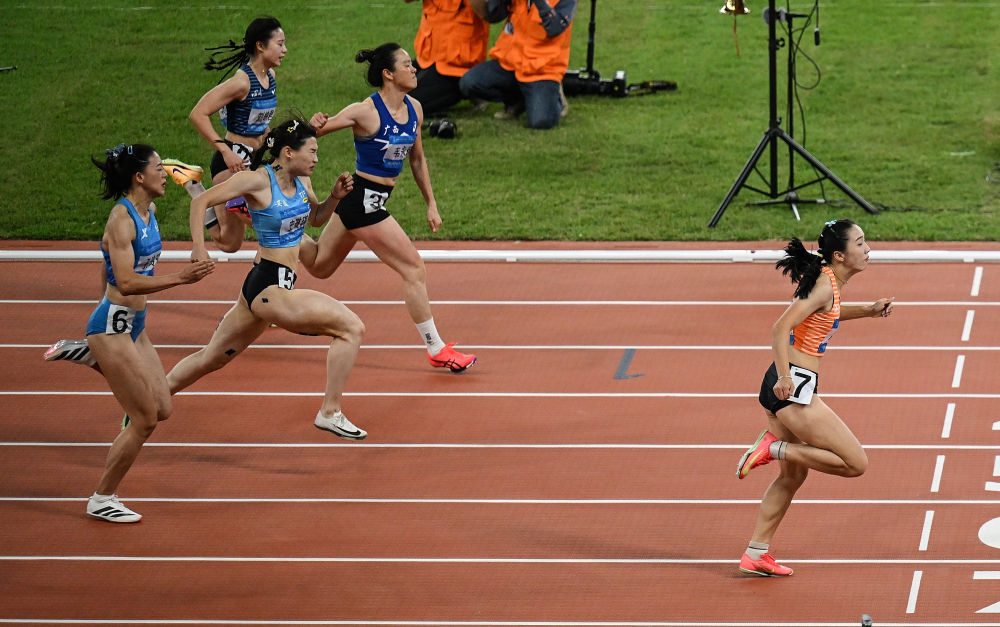 11月17日,浙江队选手陈妤颉(右)在田径女子100米决赛中率先冲线。新华社记者 周牧 摄