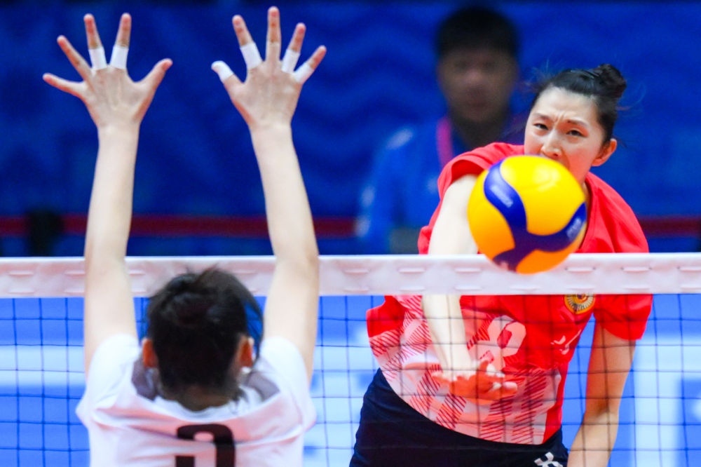 11月17日,江苏队球员吴梦洁(右)在比赛中进攻。新华社发(张金加摄)