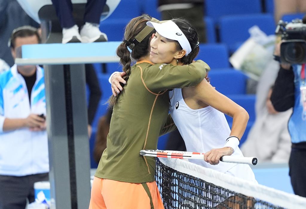 11月20日,全运会网球项目女子单打决赛后,安徽队选手朱琳(左)与北京队选手高馨妤拥抱致意。新华社记者 颜麟蕴 摄