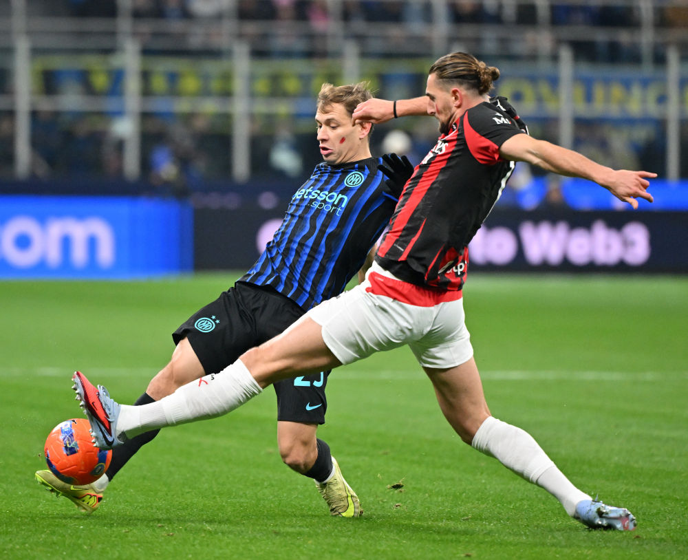 11月23日,国际米兰队球员巴雷拉(左)与AC米兰队球员拉比奥在比赛中拼抢。新华社发(阿尔贝托·林格利亚 摄)