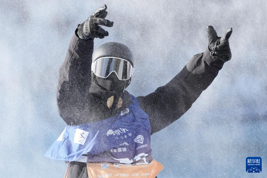 11月27日,中国选手葛春宇在单板滑雪男子大跳台资格赛中庆祝晋级。