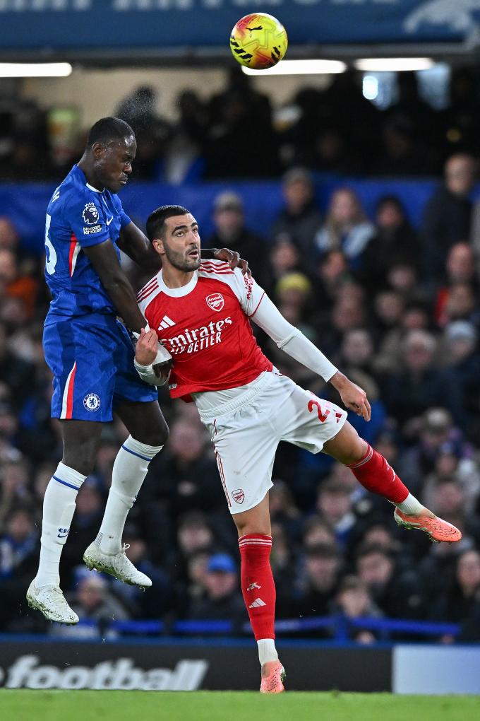 11月30日,切尔西队球员查洛巴(左)与阿森纳队球员梅里诺在比赛中争顶。新华社发
