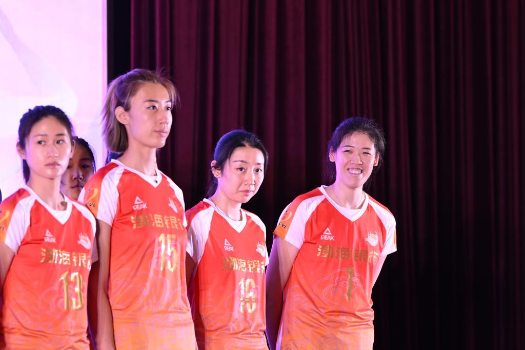 2024年10月17日,李盈莹与队友姚迪、王媛媛、孟子旋(前排从右至左)在2024-2025中国女排超级联赛天津渤海银行女排赛季出征仪式上。新华社记者 孙凡越 摄