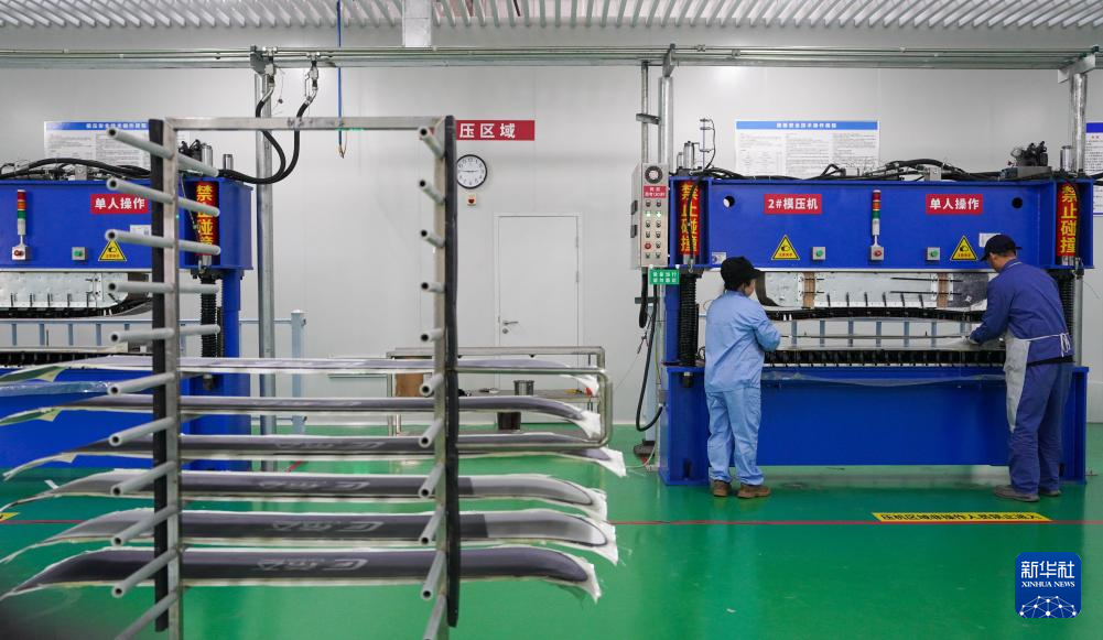 12月4日,在吉林化纤国兴复合材料有限公司车间内,工作人员用模压机制作碳纤维滑雪板。新华社记者 颜麟蕴 摄