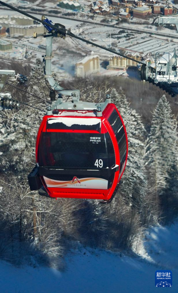 这是12月2日在吉林市北大湖滑雪度假区拍摄的由北京起重运输机械设计研究院和徐州天马索道缆车设备有限公司共同研发生产的缆车(无人机照片)。据介绍,北大湖滑雪度假区的缆车国产化达90%以上。新华社记者 颜麟蕴 摄