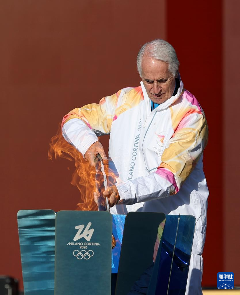 12月6日,米兰冬奥会组委会主席乔瓦尼·马拉戈在火炬传递前点燃火种盆。