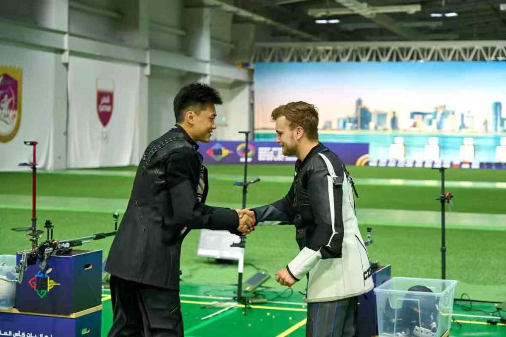 刘宇坤(左)与捷克选手普日夫拉茨基握手。图片来自国际射联官网
