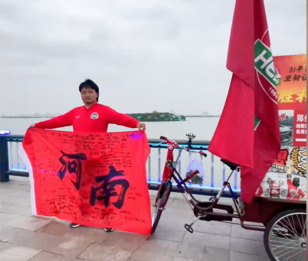 △12月6日,河南队球迷在G1801次列车上为球队加油助威。新华社记者 李嘉南 摄