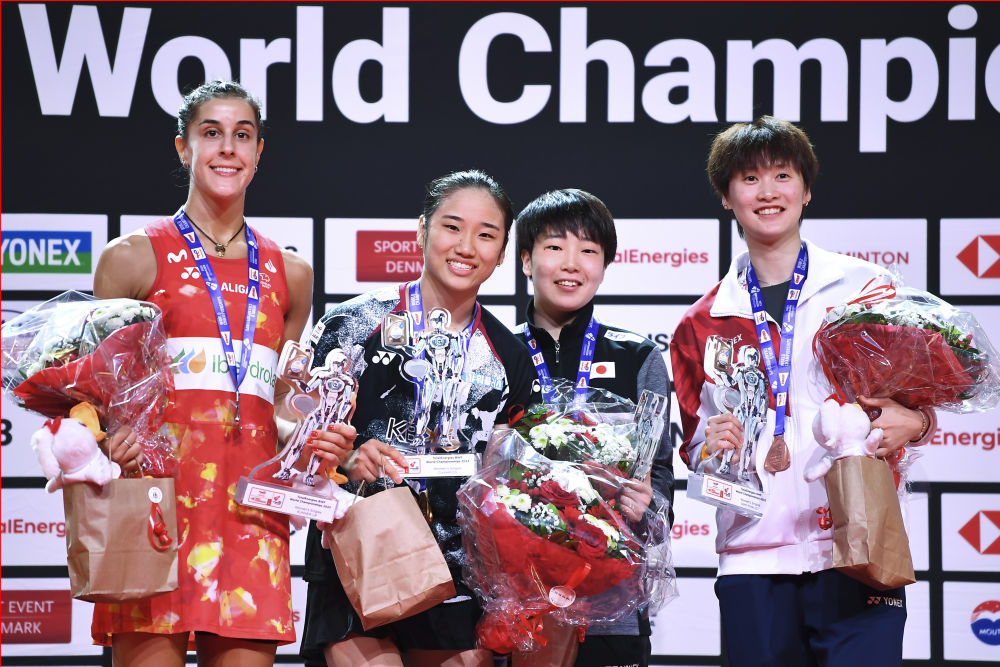 2023年8月27日,在丹麦哥本哈根举行的2023年世界羽毛球锦标赛女单决赛中,安洗莹以2:0战胜西班牙选手马林,夺得冠军。图为安洗莹(左二)、马林(左一)、以及季军陈雨菲(右一)和山口茜在颁奖仪式上。新华社记者 任鹏飞 摄