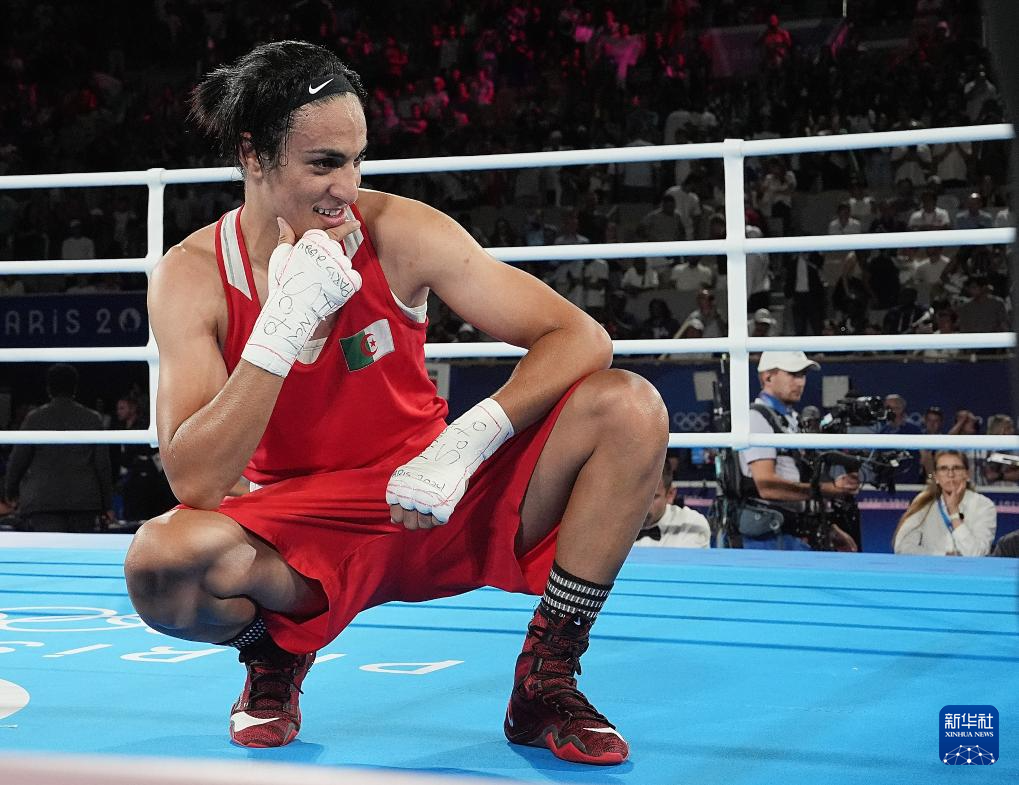 这是2024年8月9日,阿尔及利亚选手哈利夫在巴黎奥运会拳击项目女子66公斤级决赛后庆祝。哈利夫战胜中国选手杨柳,获得冠军。新华社记者 江文耀 摄