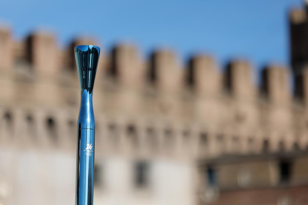 12月6日,在意大利罗马圣天使堡,火炬手、意大利篮球运动员路易吉·达托梅(左)与火炬手槙英俊在交接火炬。新华社记者 李京 摄