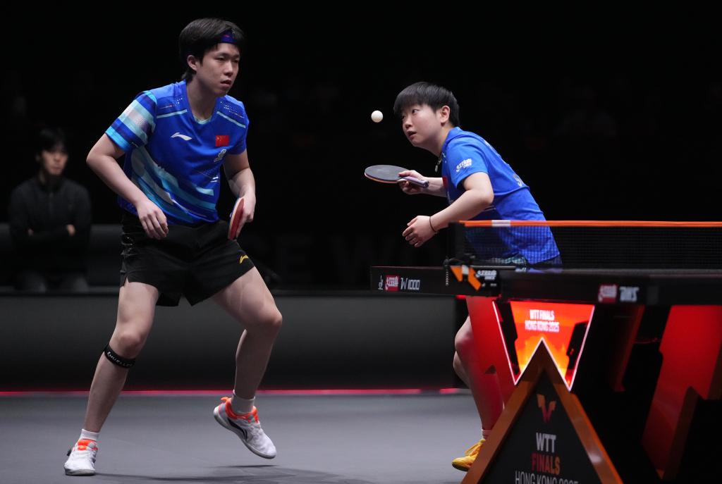 2025年12月13日,王楚钦/孙颖莎(右)在2025年世界乒乓球职业大联盟(WTT)总决赛混双决赛中。新华社发(吕小炜摄)