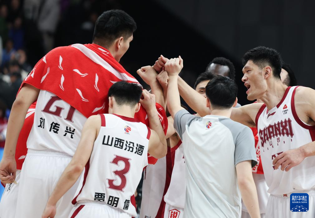 1月16日,山西汾酒队球员庆祝比赛获胜。