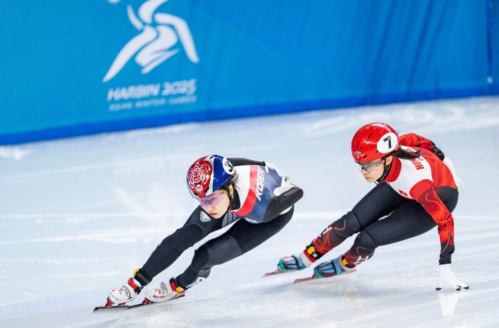 林静欣(右)在2025年第九届亚冬会短道速滑女子1500米四分之一决赛比赛中。新华社记者 孙非 摄