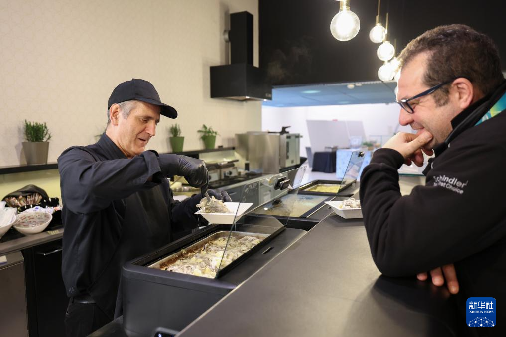 1月28日,在主媒体中心餐厅,工作人员(左)提供用餐服务。