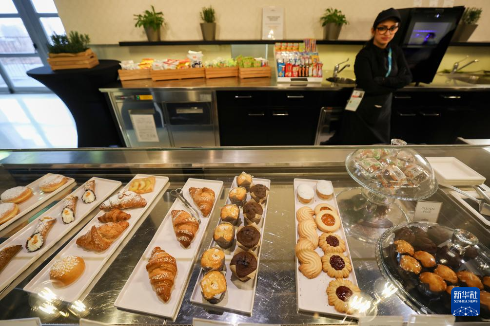1月28日,工作人员在主媒体中心餐厅区域休息、交流。