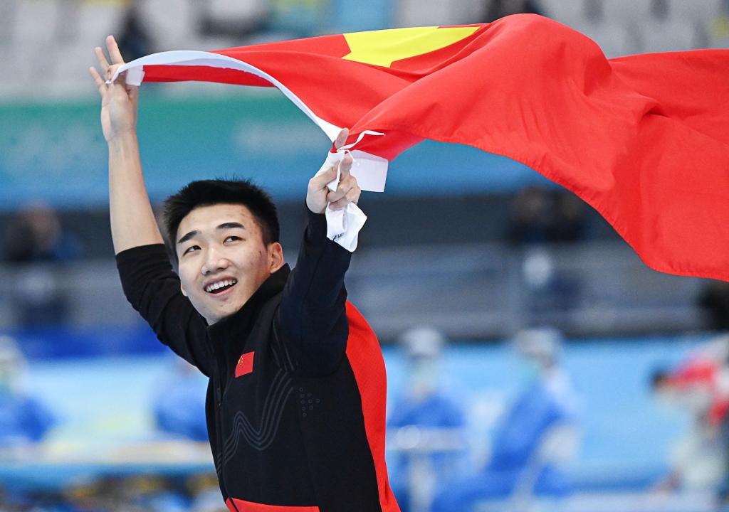 2022年2月12日,中国选手高亭宇在夺冠后庆祝。当日,北京2022年冬奥会速度滑冰男子500米决赛在国家速滑馆“冰丝带”举行。新华社记者 熊琦 摄