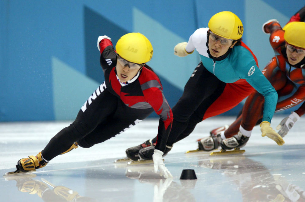 ↑2002年2月16日,杨扬(左)在盐湖城冬奥会短道速滑女子500米决赛中。