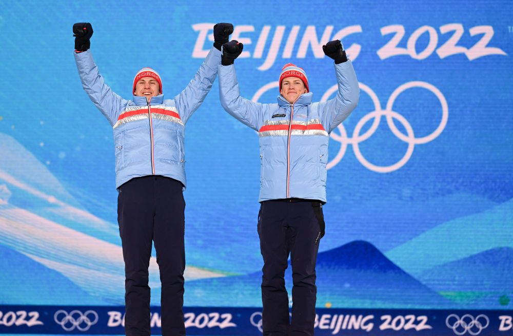 2022年2月17日,冠军挪威队选手埃里克·瓦尔内斯(左)和约翰内斯·赫斯弗洛特·克莱博在奖牌颁发仪式上。当日,北京2022年冬奥会越野滑雪男子团体短距离(传统技术)奖牌颁发仪式在张家口赛区颁奖广场举行。新华社记者 牟宇 摄