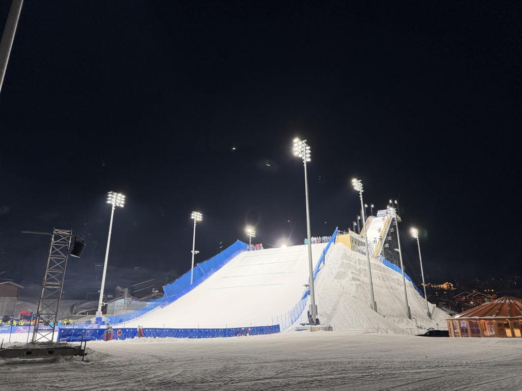 由于本届冬奥会单板滑雪大跳台比赛全部在夜间进行,为了让运动员更好地适应夜场比赛环境,此次公开训练也安排在了晚上,男子训练结束时已是大约22点40分。训练过程中,利维尼奥飘起了雪花。