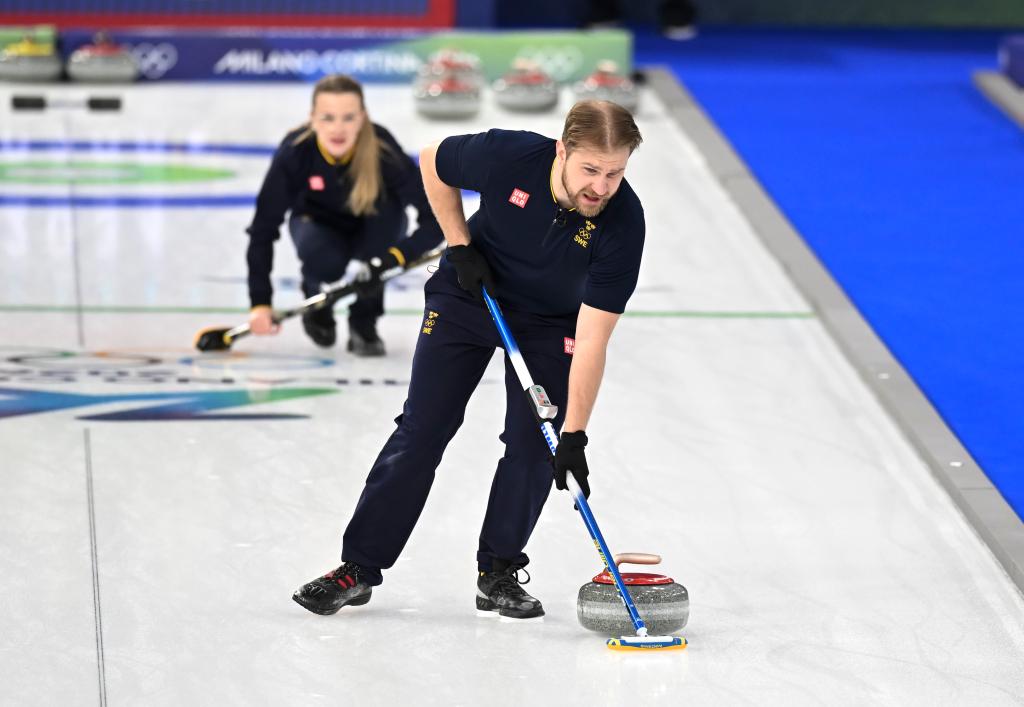 2月4日,瑞典队选手拉斯穆斯·弗拉纳(前)和伊莎贝拉·弗拉纳在对阵韩国队的比赛中。新华社记者 连漪 摄
