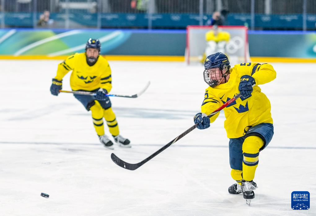 2月5日,瑞典队球员在比赛中庆祝得分。