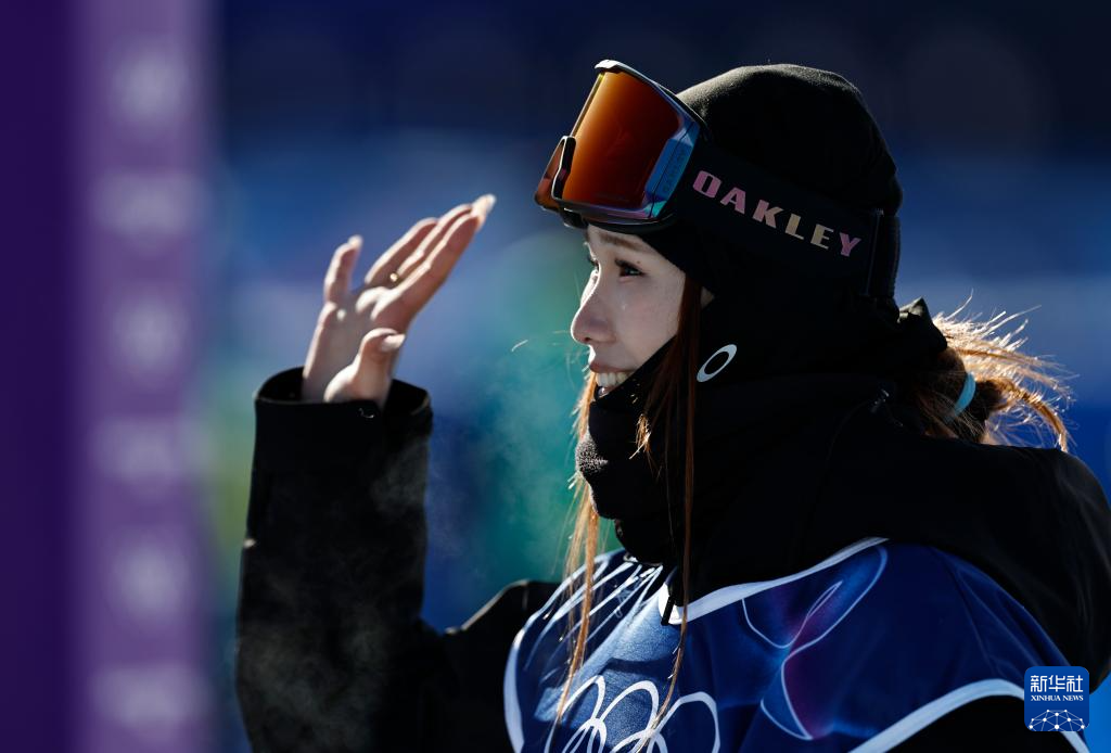 2月7日,谷爱凌(右)在比赛中和母亲交流。