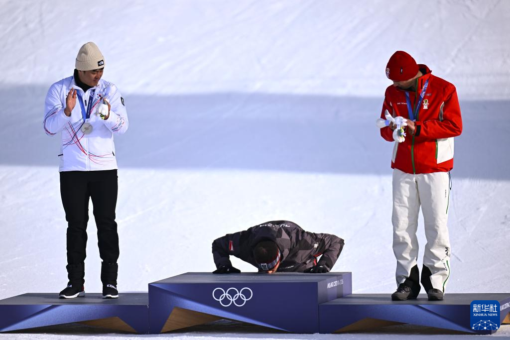 2月8日,亚军韩国选手金相谦在颁奖仪式上庆祝。