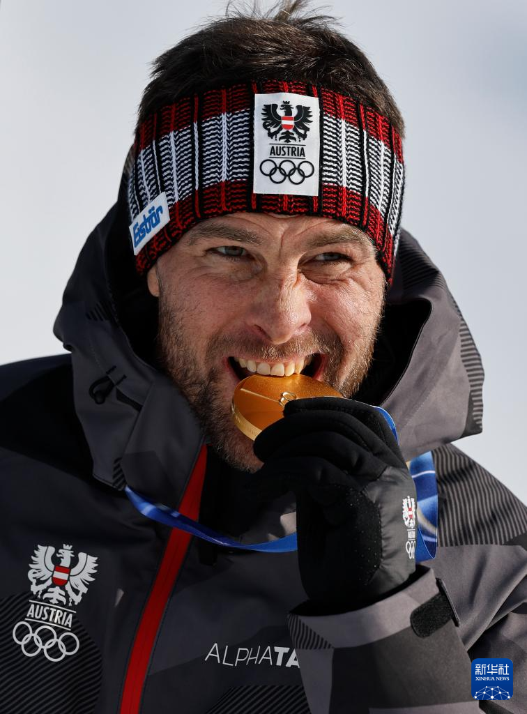2月8日,冠军奥地利选手本亚明·卡尔在颁奖仪式上庆祝。